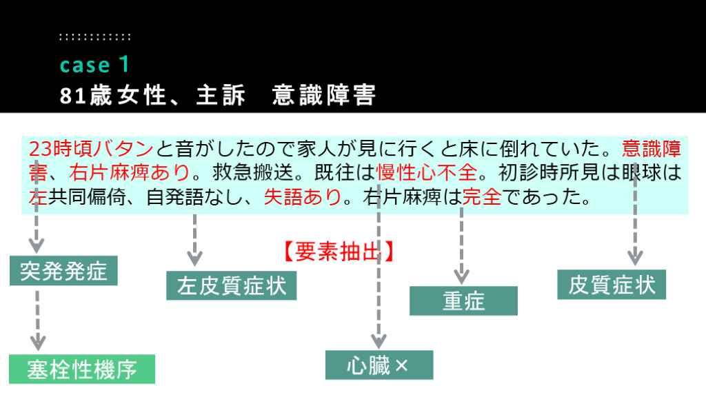 81歳女性、主訴 意識障害 【要素抽出】 突発発症 左皮質症状 心臓× 重症 皮質症状 塞栓性機序
