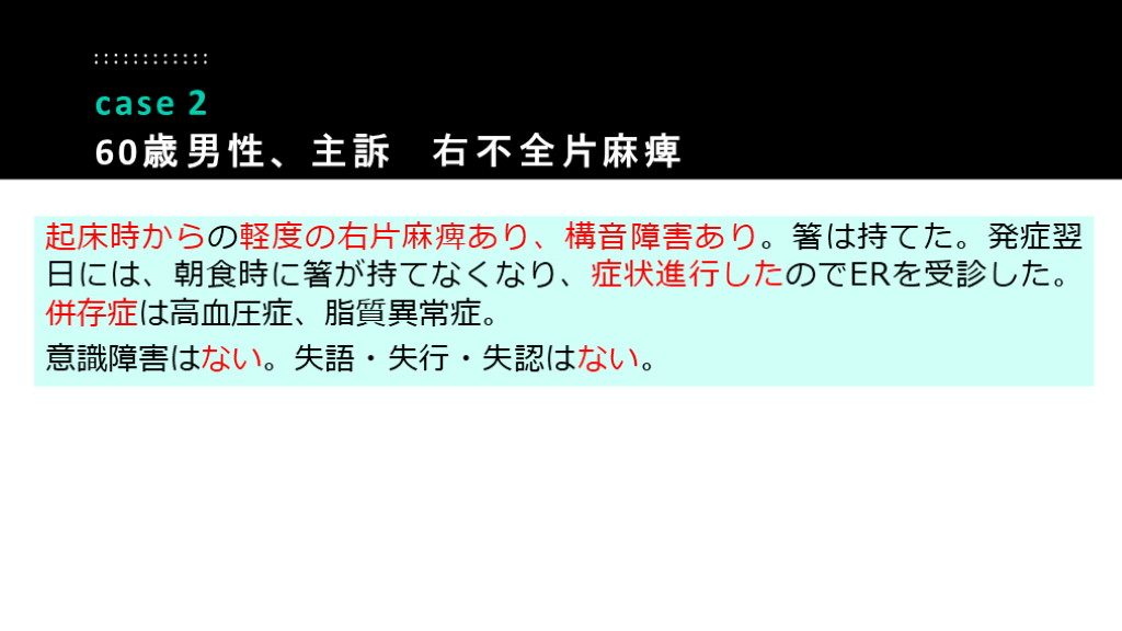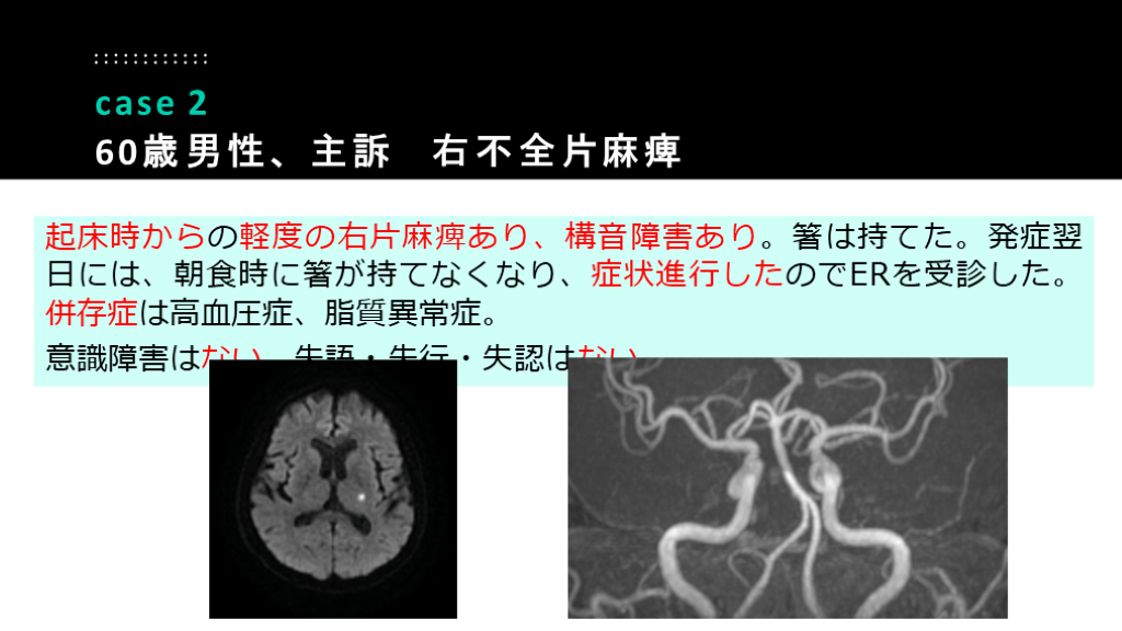 #39. 起床時からの軽度の右片麻痺あり、構音障害あり。箸は持てた。発症翌日には、朝食時に箸が持てなくなり、症状進行したのでERを受診した。併存症は高血圧症、脂質異常症。