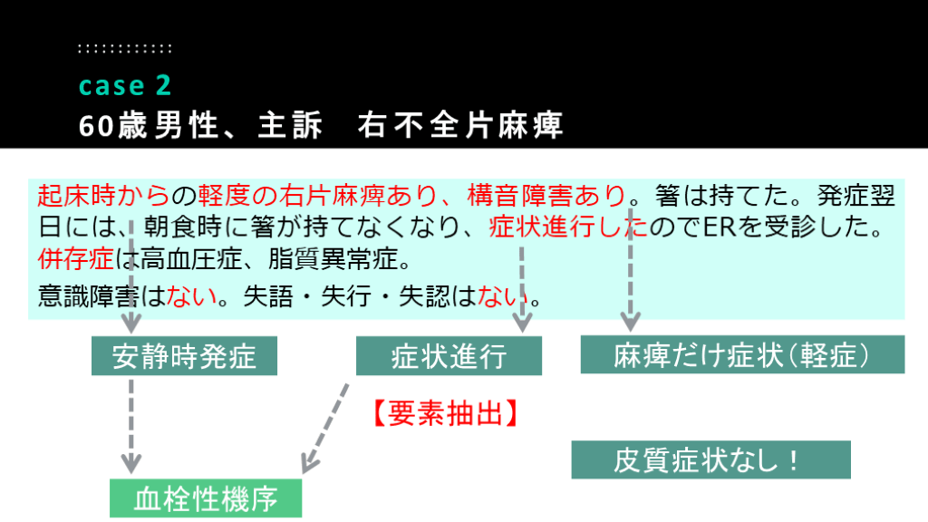 60歳男性、主訴 右不全片麻痺 安静時発症 血栓性機序 症状進行 麻痺だけ症状(軽症) 皮質症状なし! 【要素抽出】