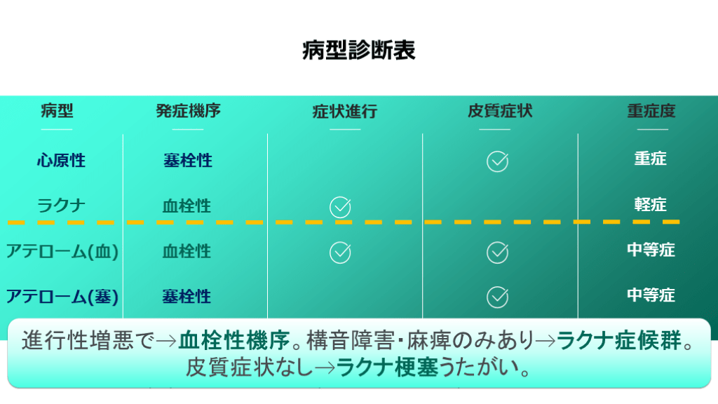 ※アテローム(塞)→動脈原性塞栓症 (A-to-A embolism) 症状進行 皮質症状 発症機序 重症度 病型診断表 病型 心原性 ラクナ アテローム(血) アテローム(塞) 塞栓性 血栓性 血栓性 塞栓性 重症 軽症 中等症 中等症 進行性増悪で→血栓性機序。構音障害・麻痺のみあり→ラクナ症候群。