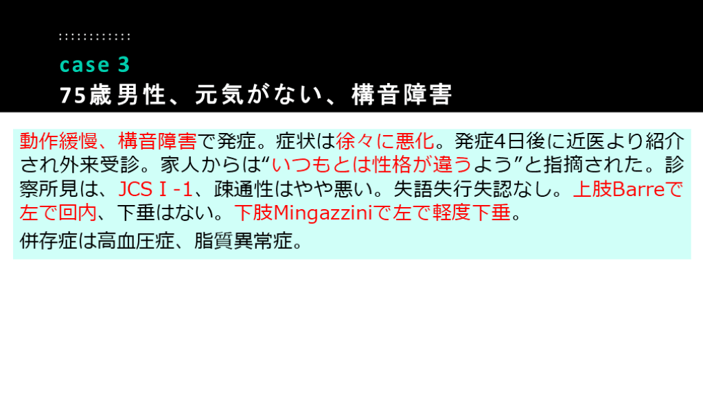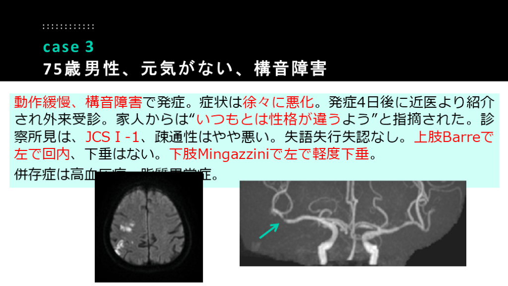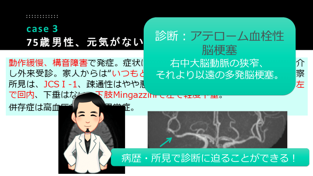 75歳男性、元気がない、構音障害 診断:アテローム血栓性