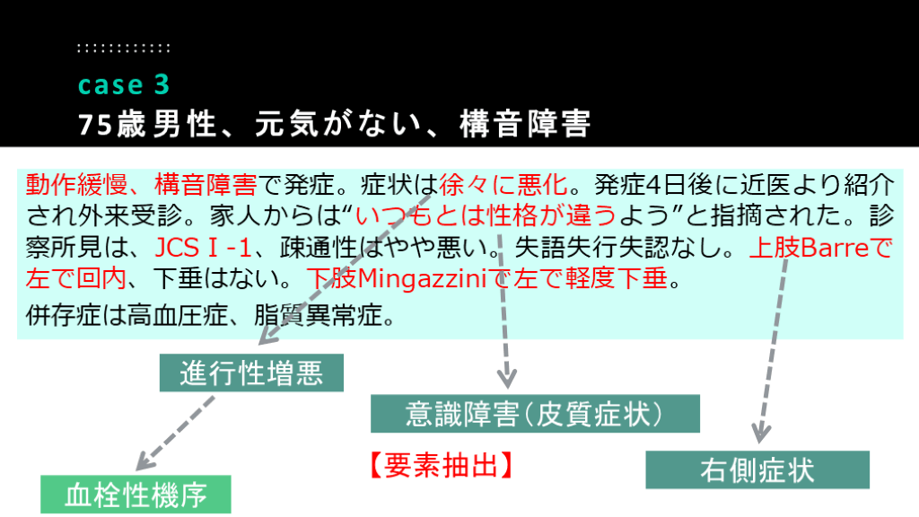 75歳男性、元気がない、構音障害 進行性増悪 血栓性機序 意識障害(皮質症状) 右側症状 【要素抽出】