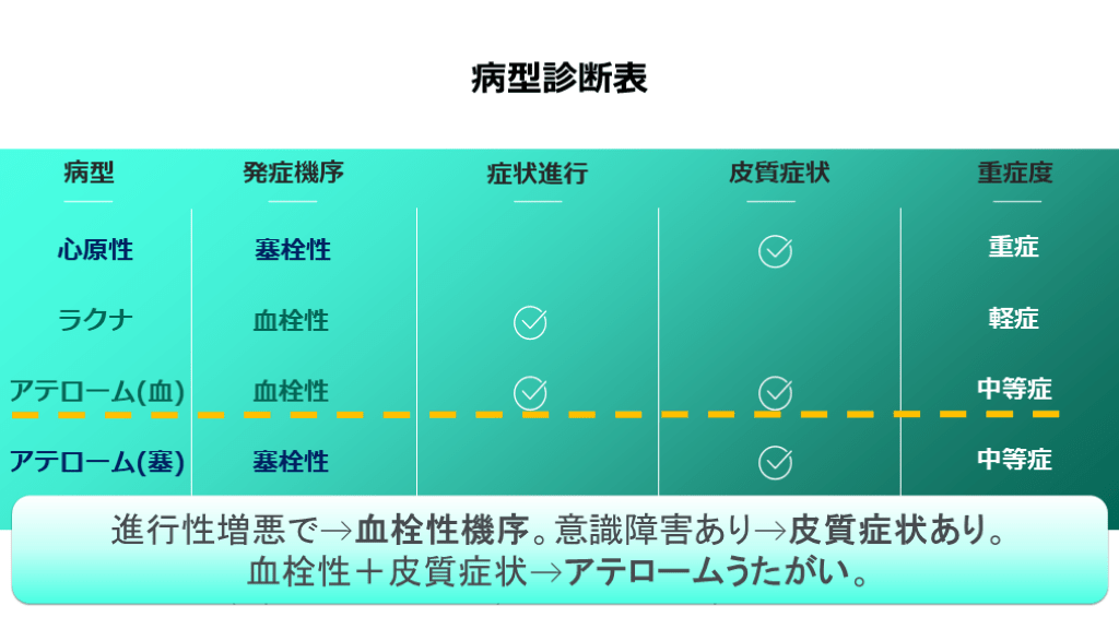 血栓性+皮質症状→アテロームうたがい。