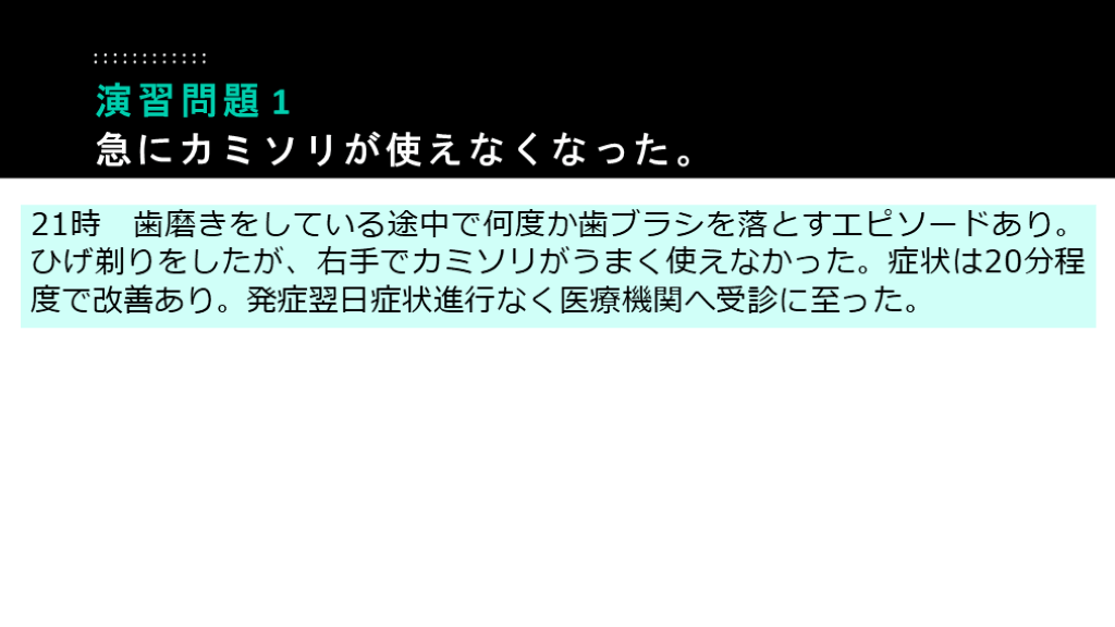 #49. 21時 歯磨きをしている途中で何度か歯ブラシを落とすエピソードあり。ひげ剃りをしたが、右手でカミソリがうまく使えなかった。症状は20分程度で改善あり。発症翌日症状進行なく医療機関へ受診に至った。 演習問題 1