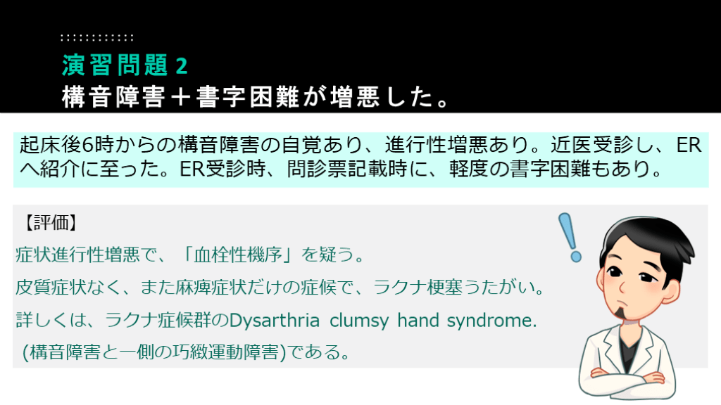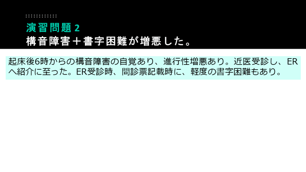 #51. 起床後6時からの構音障害の自覚あり、進行性増悪あり。近医受診し、ERへ紹介に至った。ER受診時、問診票記載時に、軽度の書字困難もあり。 演習問題 2