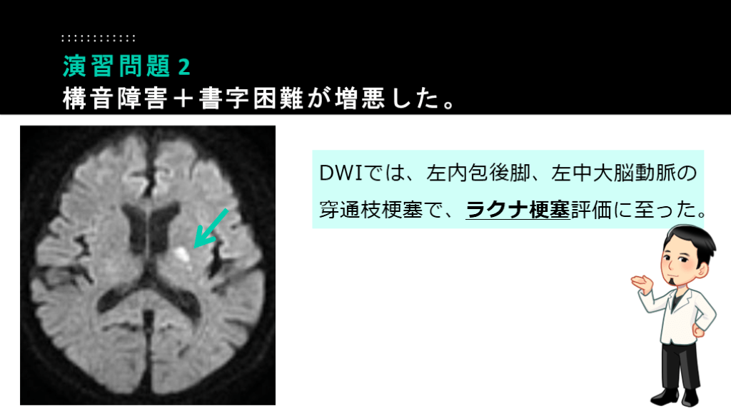 #52. 起床後6時からの構音障害の自覚あり、進行性増悪あり。近医受診し、ERへ紹介に至った。ER受診時、問診票記載時に、軽度の書字困難もあり。 演習問題 2