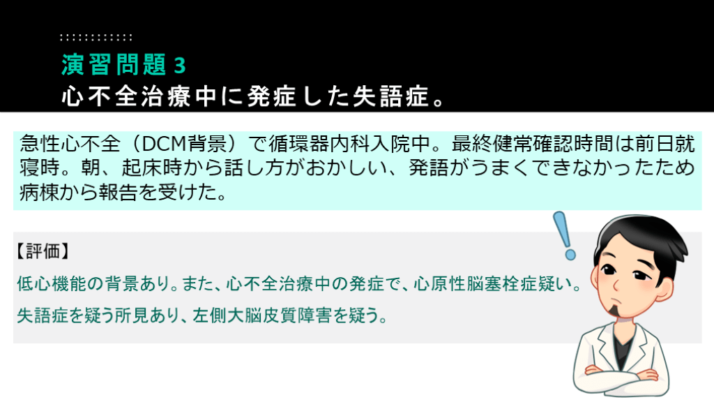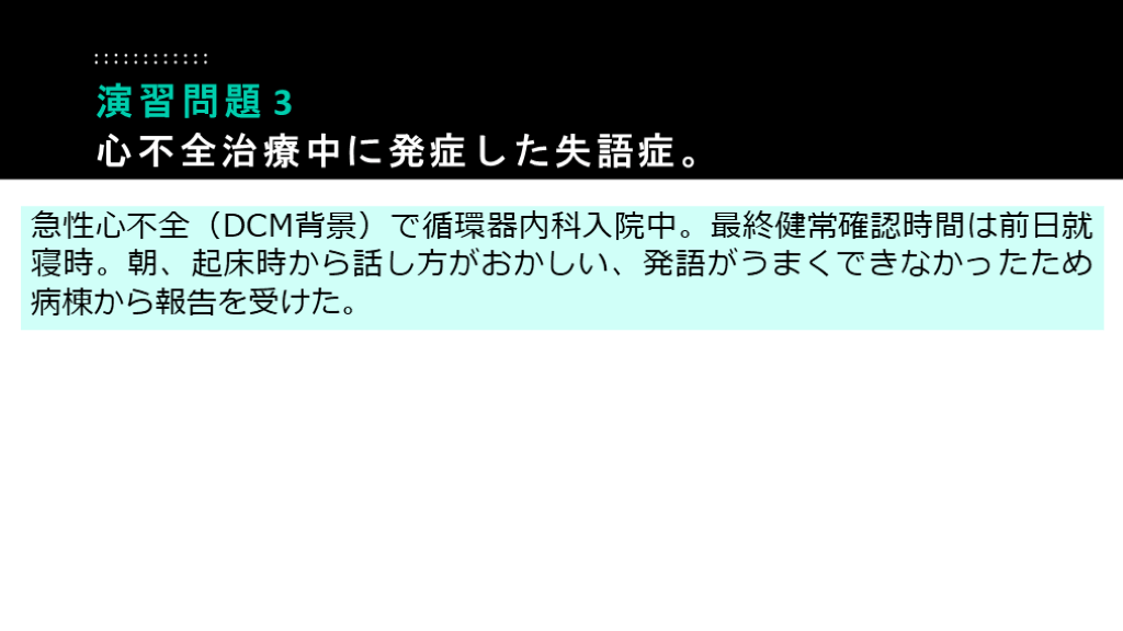 #55. 急性心不全(DCM背景)で循環器内科入院中。最終健常確認時間は前日就寝時。朝、起床時から話し方がおかしい、発語がうまくできなかったため病棟から報告を受けた。 演習問題 3