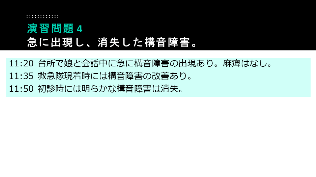 #57. 11:20 台所で娘と会話中に急に構音障害の出現あり。麻痺はなし。