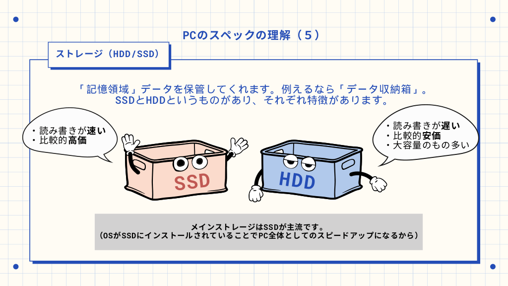 #10. PCのスペックの理解(5) ストレージ(HDD/SSD) 「記憶領域」データを保管してくれます。例えるなら「データ収納箱」。 SSDとHDDというものがあり、それぞれ特徴があります。 ・読み書きが遅い ・比較的安価 ・大容量のもの多い ・読み書きが速い ・比較的高価 SSD HDD メインストレージはSSDが主流です。 (OSがSSDにインストールされていることでPC全体としてのスピードアップになるから)