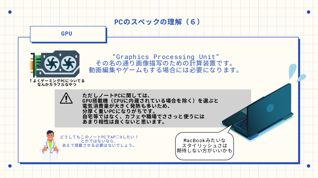 #11. PCのスペックの理解(6) GPU “Graphics Processing Unit” その名の通り画像描写のための計算装置です。 動画編集やゲームもする場合には必要になります。 ↑よくゲーミングPCについてる なんかカラフルなやつ ただしノートPCに関しては、 GPU搭載機(CPUに内蔵されている場合を除く)を選ぶと 電気消費量が大きく発熱も多いため、 分厚く重いPCになりがちです。 自宅等ではなく、カフェや職場でささっと使うには あまり相性は良くないと思います。 どうしてもこのノートPCでAP○Xしたい! とかではないなら、 あえて搭載させる必要はないでしょう。 MacBookみたいな スタイリッシュさは 期待しない方がいいかも