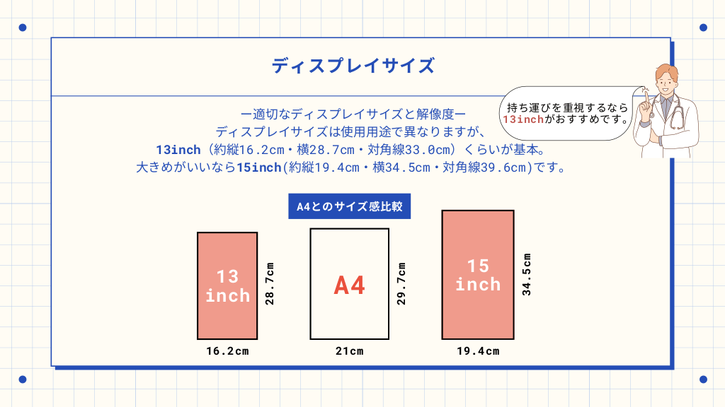 #12. ディスプレイサイズ 持ち運びを重視するなら ー適切なディスプレイサイズと解像度ー 13inchがおすすめです。 ディスプレイサイズは使用用途で異なりますが、 13inch(約縦16.2cm・横28.7cm・対角線33.0cm)くらいが基本。 大きめがいいなら15inch(約縦19.4cm・横34.5cm・対角線39.6cm)です。 16.2cm 21cm 15 inch 19.4cm 34.5cm A4 29.7cm 13 inch 28.7cm A4とのサイズ感比較