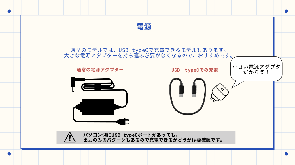 #13. 電源 薄型のモデルでは、USB typeCで充電できるモデルもあります。 大きな電源アダプターを持ち運ぶ必要がなくなるので、おすすめです。 通常の電源アダプター USB typeCでの充電 パソコン側にUSB typeCポートがあっても、 出力のみのパターンもあるので充電できるかどうかは要確認です。 小さい電源アダプタ だから楽!