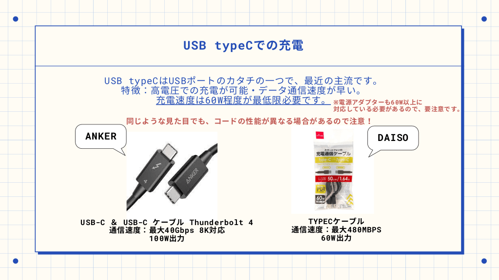 #14. USB typeCでの充電 USB typeCはUSBポートのカタチの一つで、最近の主流です。 特徴:高電圧での充電が可能・データ通信速度が早い。 充電速度は60W程度が最低限必要です。 ※電源アダプターも60W以上に 対応している必要があるので、要注意です。 同じような見た目でも、コードの性能が異なる場合があるので注意! ANKER USB-C & USB-C ケーブル Thunderbolt 4 通信速度:最大40Gbps 8K対応 100W出力 DAISO TYPECケーブル 通信速度:最大480MBPS 60W出力