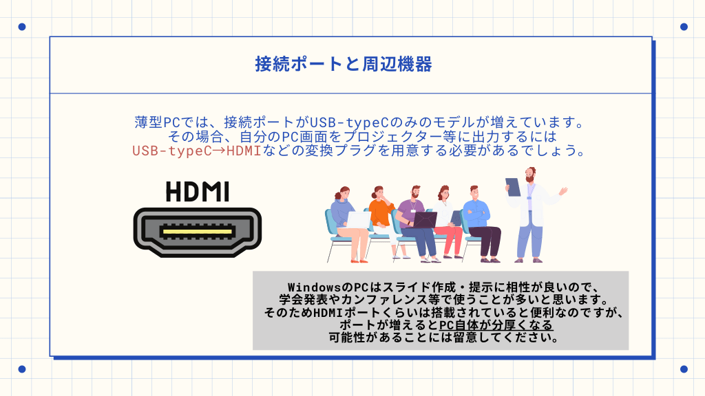 #15. 接続ポートと周辺機器 薄型PCでは、接続ポートがUSB-typeCのみのモデルが増えています。 その場合、自分のPC画面をプロジェクター等に出力するには USB-typeC→HDMIなどの変換プラグを用意する必要があるでしょう。 WindowsのPCはスライド作成・提示に相性が良いので、 学会発表やカンファレンス等で使うことが多いと思います。 そのためHDMIポートくらいは搭載されていると便利なのですが、 ポートが増えるとPC自体が分厚くなる 可能性があることには留意してください。