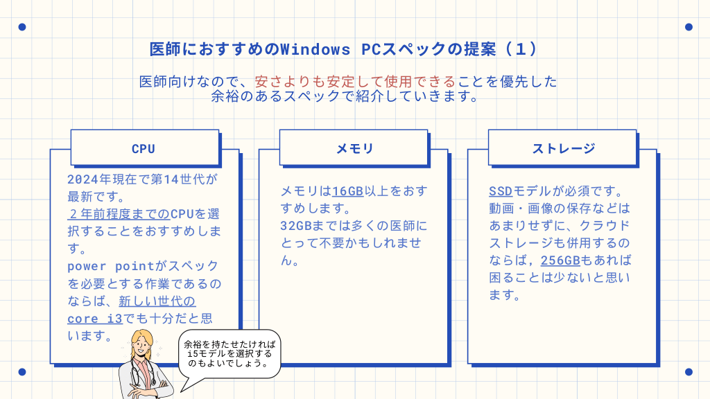 #16. 医師におすすめのWindows PCスペックの提案(1) 医師向けなので、安さよりも安定して使用できることを優先した 余裕のあるスペックで紹介していきます。 CPU 2024年現在で第14世代が 最新です。 2年前程度までのCPUを選 択することをおすすめしま す。 power pointがスペック を必要とする作業であるの ならば、新しい世代の core i3でも十分だと思 います。 余裕を持たせたければ i5モデルを選択する のもよいでしょう。 メモリ ストレージ メモリは16GB以上をおす すめします。 32GBまでは多くの医師に とって不要かもしれませ ん。 SSDモデルが必須です。 動画・画像の保存などは あまりせずに、クラウド ストレージも併用するの ならば,256GBもあれば 困ることは少ないと思い ます。