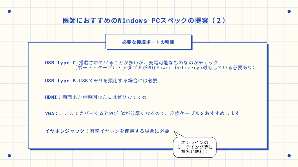 #17. 医師におすすめのWindows PCスペックの提案(2) 必要な接続ポートの種類 USB type C:搭載されていることが多いが、充電可能なものなのかチェック (ポート・ケーブル・アダプタがPD(Power Delivery)対応している必要あり) USB type B:USBメモリを頻用する場合には必要 HDMI:画面出力が頻回な方にはぜひおすすめ VGA:ここまでカバーするとPC自体が分厚くなるので、変換ケーブルをおすすめします イヤホンジャック:有線イヤホンを使用する場合に必要 オンラインの ミーテイング等に 意外と便利!