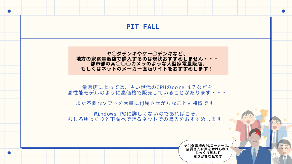 #18. PIT FALL ヤ○ダデンキやケー○デンキなど、 地方の家電量販店で購入するのは現状おすすめしません・・・ 都市部の某○○○カメラのような大型家電量販店、 もしくはネットのメーカー直販サイトをおすすめします! 量販店によっては、古い世代のCPUのcore i7などを 高性能モデルのように高価格で販売していることがあります・・・ また不要なソフトを大量に付属させがちなことも特徴です。 Windows PCに詳しくないのであればこそ、 むしろゆっくりと下調べできるネットでの購入をおすすめします。 ヤ○ダ電機のPCコーナーは、 店員さんに声をかけられて じっくり見れず 焦りがちな私です
