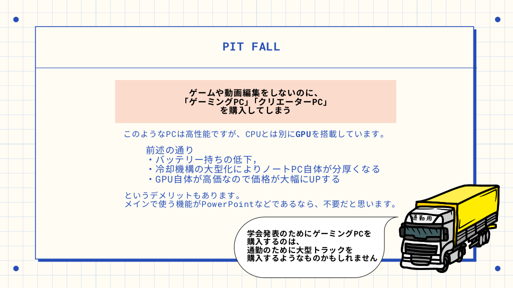 #19. PIT FALL ゲームや動画編集をしないのに、 「ゲーミングPC」「クリエーターPC」 を購入してしまう このようなPCは高性能ですが、CPUとは別にGPUを搭載しています。 前述の通り ・バッテリー持ちの低下, ・冷却機構の大型化によりノートPC自体が分厚くなる ・GPU自体が高価なので価格が大幅にUPする というデメリットもあります。 メインで使う機能がPowerPointなどであるなら、不要だと思います。 通勤用 学会発表のためにゲーミングPCを 購入するのは、 通勤のために大型トラックを 購入するようなものかもしれません