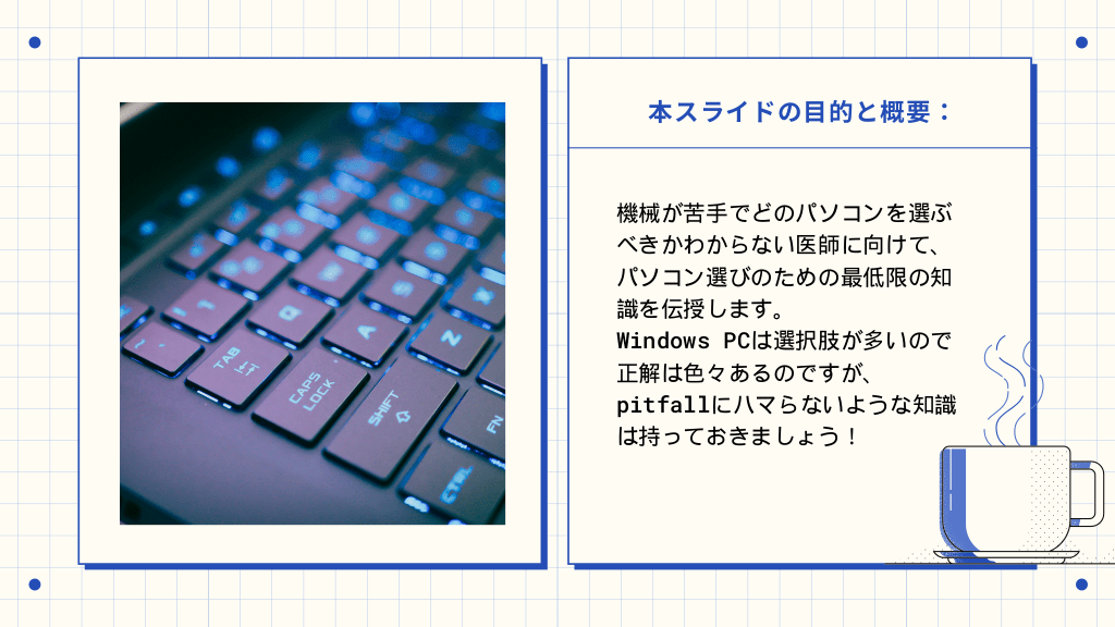 #2. 本スライドの目的と概要: 機械が苦手でどのパソコンを選ぶ べきかわからない医師に向けて、 パソコン選びのための最低限の知 識を伝授します。 Windows PCは選択肢が多いので 正解は色々あるのですが、 pitfallにハマらないような知識 は持っておきましょう!