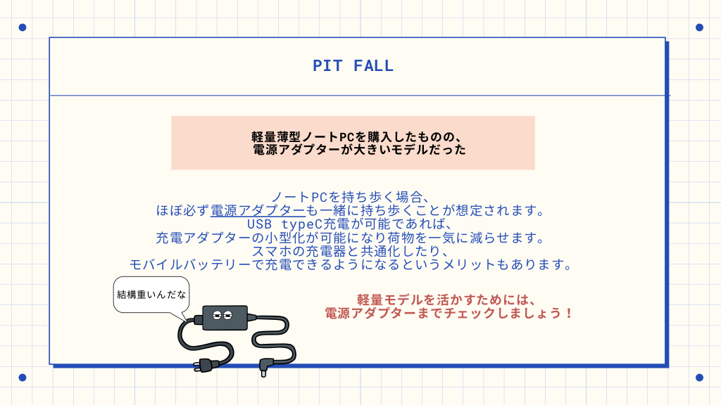 #21. PIT FALL 軽量薄型ノートPCを購入したものの、 電源アダプターが大きいモデルだった ノートPCを持ち歩く場合、 ほぼ必ず電源アダプターも一緒に持ち歩くことが想定されます。 USB typeC充電が可能であれば、 充電アダプターの小型化が可能になり荷物を一気に減らせます。 スマホの充電器と共通化したり、 モバイルバッテリーで充電できるようになるというメリットもあります。 結構重いんだな 軽量モデルを活かすためには、 電源アダプターまでチェックしましょう!