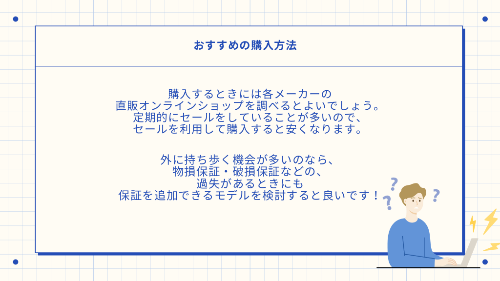 #22. おすすめの購入方法 購入するときには各メーカーの 直販オンラインショップを調べるとよいでしょう。 定期的にセールをしていることが多いので、 セールを利用して購入すると安くなります。 外に持ち歩く機会が多いのなら、 物損保証・破損保証などの、 過失があるときにも 保証を追加できるモデルを検討すると良いです!