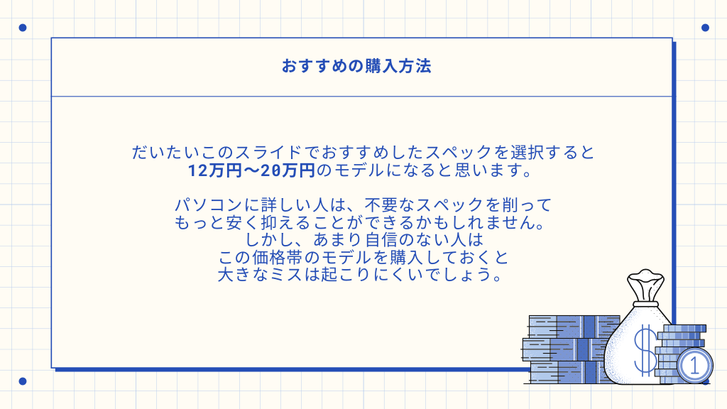 #23. おすすめの購入方法 だいたいこのスライドでおすすめしたスペックを選択すると 12万円〜20万円のモデルになると思います。 パソコンに詳しい人は、不要なスペックを削って もっと安く抑えることができるかもしれません。 しかし、あまり自信のない人は この価格帯のモデルを購入しておくと 大きなミスは起こりにくいでしょう。