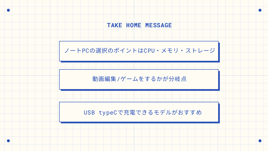 #24. TAKE HOME MESSAGE ノートPCの選択のポイントはCPU・メモリ・ストレージ 動画編集/ゲームをするかが分岐点 USB typeCで充電できるモデルがおすすめ