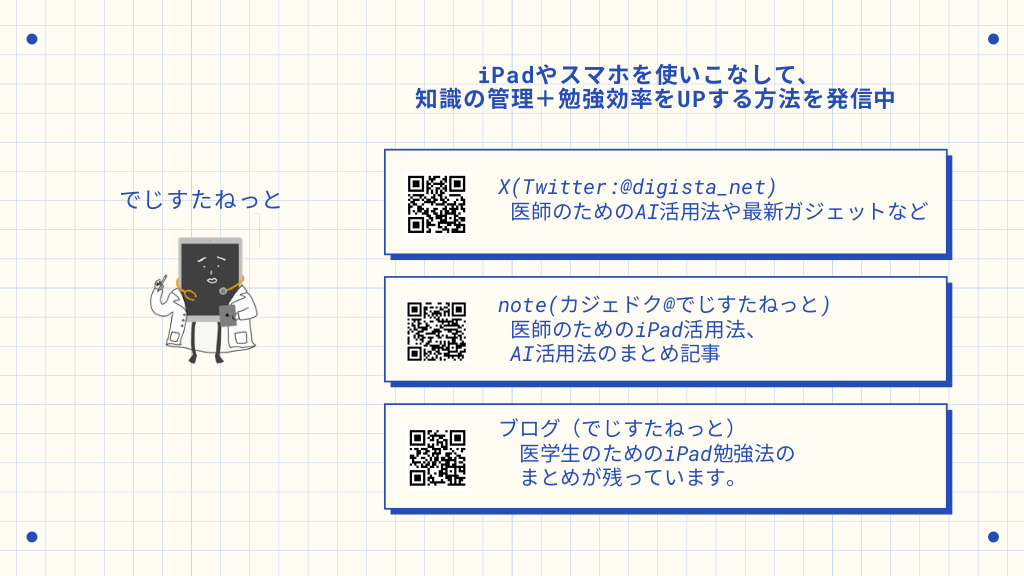 #25. iPadやスマホを使いこなして、 知識の管理+勉強効率をUPする方法を発信中 でじすたねっと X(Twitter:@digista_net) 医師のためのAI活用法や最新ガジェットなど note(カジェドク@でじすたねっと) 医師のためのiPad活用法、 AI活用法のまとめ記事 ブログ(でじすたねっと) 医学生のためのiPad勉強法の まとめが残っています。
