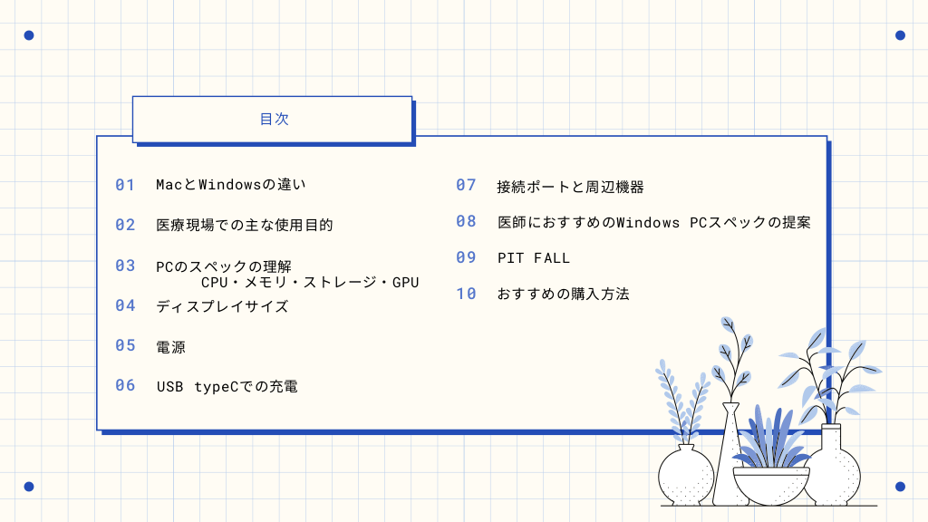#3. 目次 01 MacとWindowsの違い 07 接続ポートと周辺機器 02 医療現場での主な使用目的 08 医師におすすめのWindows PCスペックの提案 09 PIT FALL 10 おすすめの購入方法 03 PCのスペックの理解 CPU・メモリ・ストレージ・GPU 04 ディスプレイサイズ 05 電源 06 USB typeCでの充電