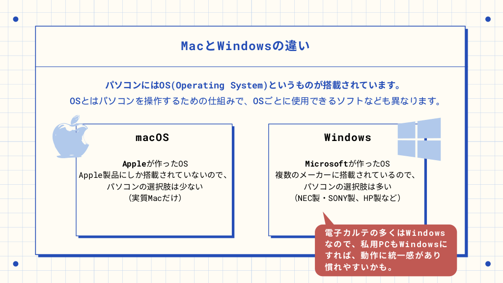 #4. MacとWindowsの違い パソコンにはOS(Operating System)というものが搭載されています。 OSとはパソコンを操作するための仕組みで、OSごとに使用できるソフトなども異なります。 macOS Appleが作ったOS Apple製品にしか搭載されていないので、 パソコンの選択肢は少ない (実質Macだけ) Windows Microsoftが作ったOS 複数のメーカーに搭載されているので、 パソコンの選択肢は多い (NEC製・SONY製、HP製など) 電子カルテの多くはWindows なので、私用PCもWindowsに すれば、動作に統一感があり 慣れやすいかも。