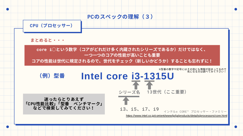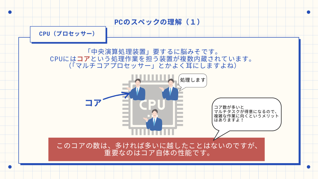 #6. PCのスペックの理解(1) CPU(プロセッサー) 「中央演算処理装置」要するに脳みそです。 CPUにはコアという処理作業を担う装置が複数内蔵されています。 (「マルチコアプロセッサー」とかよく耳にしますよね) 処理します コア コア数が多いと マルチタスクが得意になるので、 複雑な作業に向くというメリット はありますよ! このコアの数は、多ければ多いに越したことはないのですが、 重要なのはコア自体の性能です。