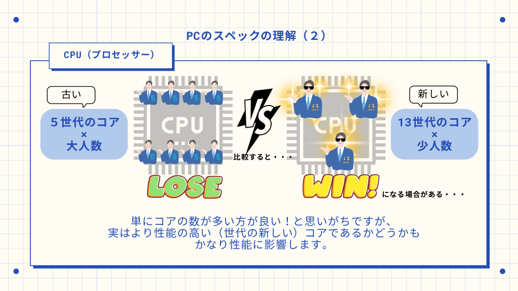 #7. PCのスペックの理解(2) CPU(プロセッサー) 新しい 古い 5世代のコア × 大人数 比較すると・・・ 13世代のコア × 少人数 になる場合がある・・・ 単にコアの数が多い方が良い!と思いがちですが、 実はより性能の高い(世代の新しい)コアであるかどうかも かなり性能に影響します。