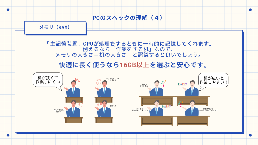 #9. PCのスペックの理解(4) メモリ(RAM) 「主記憶装置」CPUが処理をするときに一時的に記憶してくれます。 例えるなら「作業をする机」なので、 メモリの大きさ=机の大きさ と認識すると良いでしょう。 快適に長く使うなら16GB以上を選ぶと安心です。 机が狭くて 作業しにくい むしろ何をしろと いうのか いや〜 捗りますわ〜 机が広いと 作業しやすい! 家帰るわ 何もできねえ 寝るか さ〜てと 本気出すとしますかW 労働環境って やっぱ大事なんだなって