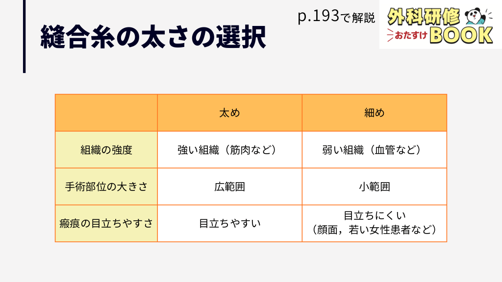 縫合糸のサイズや太さでの使い分けや,手術で使う糸の種類(素材/機能/構造)の特徴と比較をまとめています。