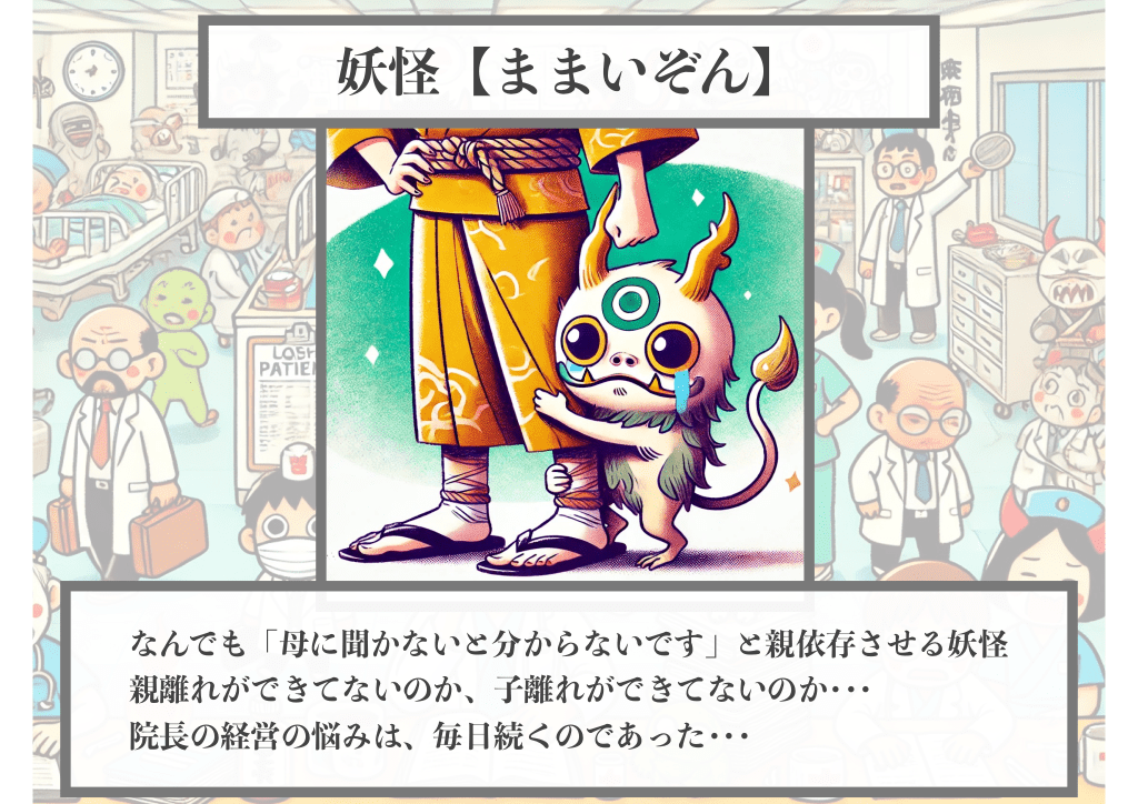 #13. 妖怪【ままいぞん】 なんでも「母に聞かないと分からないです」と親依存させる妖怪 親離れができてないのか、子離れができてないのか・・・ 院長の経営の悩みは、毎日続くのであった・・・