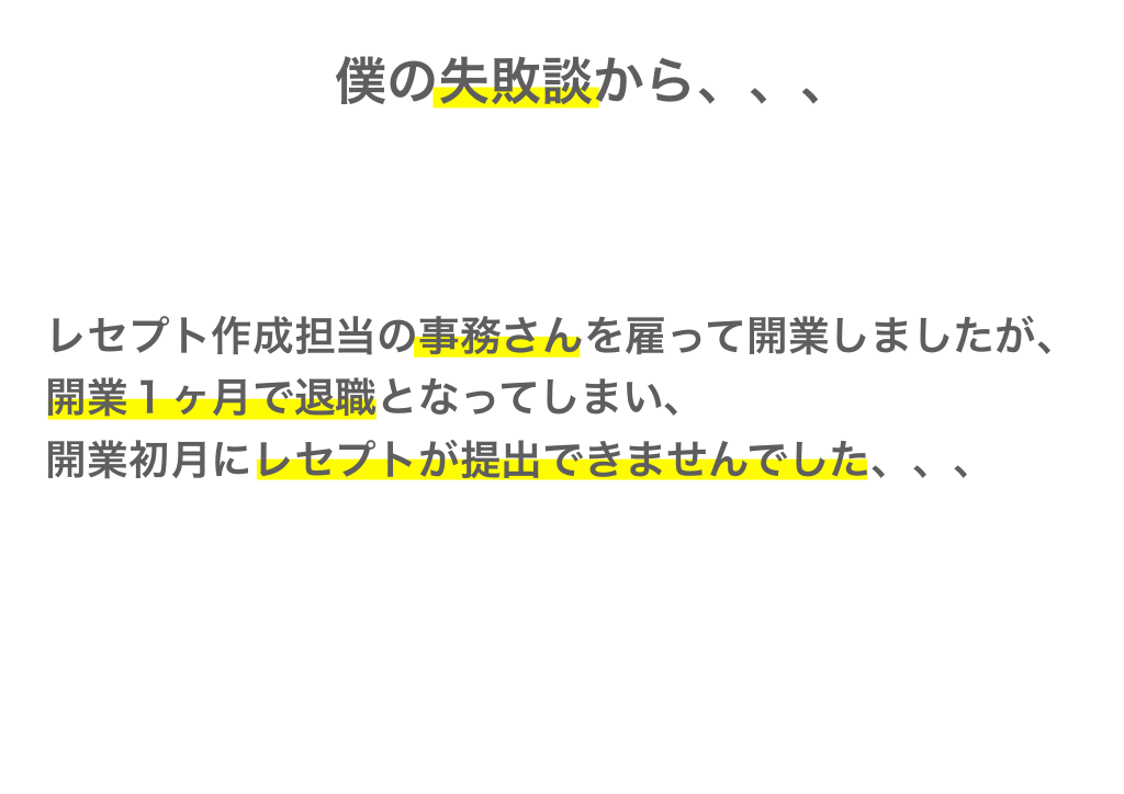 #3. 僕の失敗談から、、、 レセプト作成担当の事務さんを雇って開業しましたが、 開業1ヶ月で退職となってしまい、 開業初月にレセプトが提出できませんでした、、、