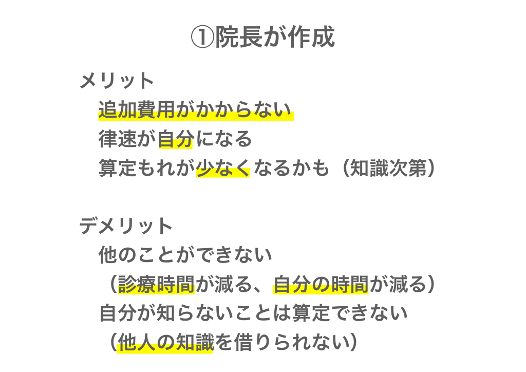 #6. ①院長が作成 メリット 追加費用がかからない 律速が自分になる 算定もれが少なくなるかも(知識次第) デメリット 他のことができない (診療時間が減る、自分の時間が減る) 自分が知らないことは算定できない (他人の知識を借りられない)