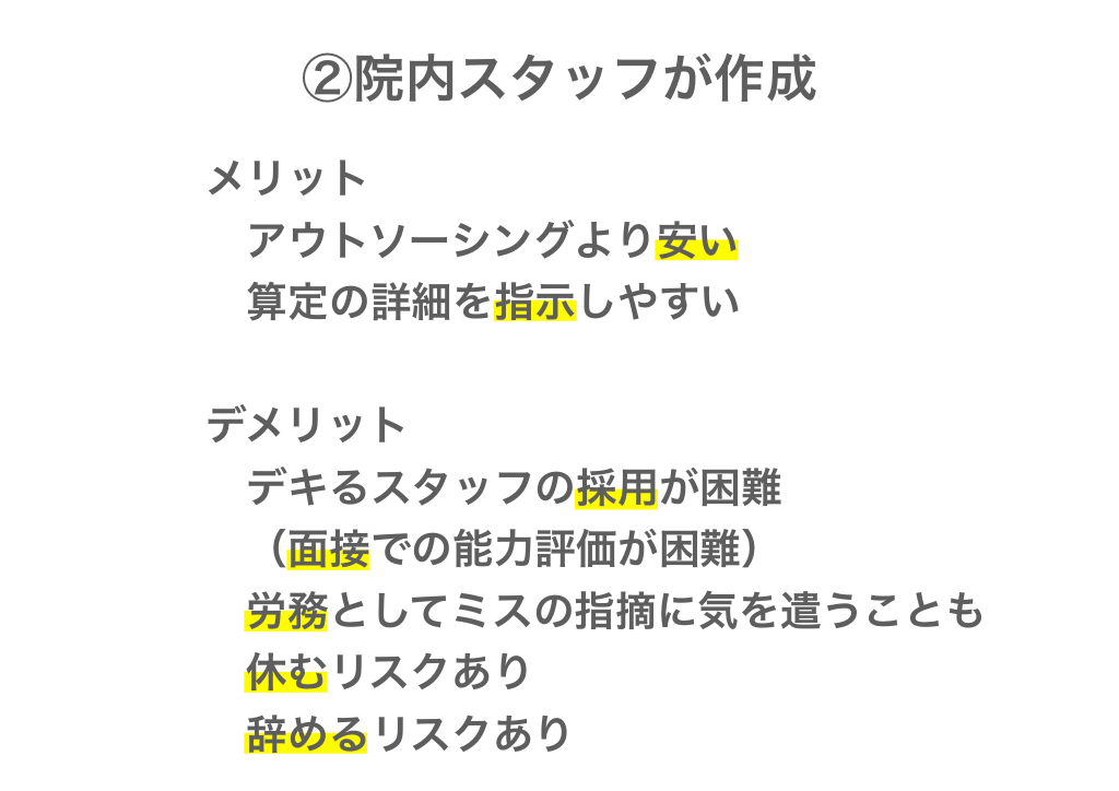 #7. ②院内スタッフが作成 メリット アウトソーシングより安い 算定の詳細を指示しやすい デメリット デキるスタッフの採用が困難 (面接での能力評価が困難) 労務としてミスの指摘に気を遣うことも 休むリスクあり 辞めるリスクあり
