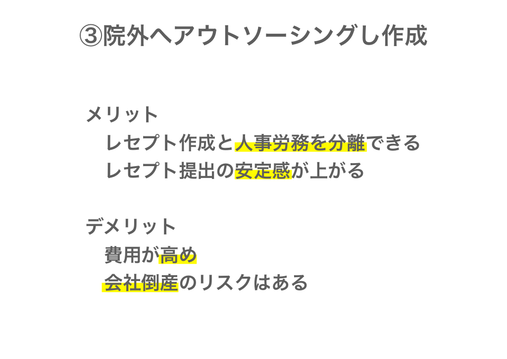 #8. ③院外へアウトソーシングし作成 メリット レセプト作成と人事労務を分離できる レセプト提出の安定感が上がる デメリット 費用が高め 会社倒産のリスクはある