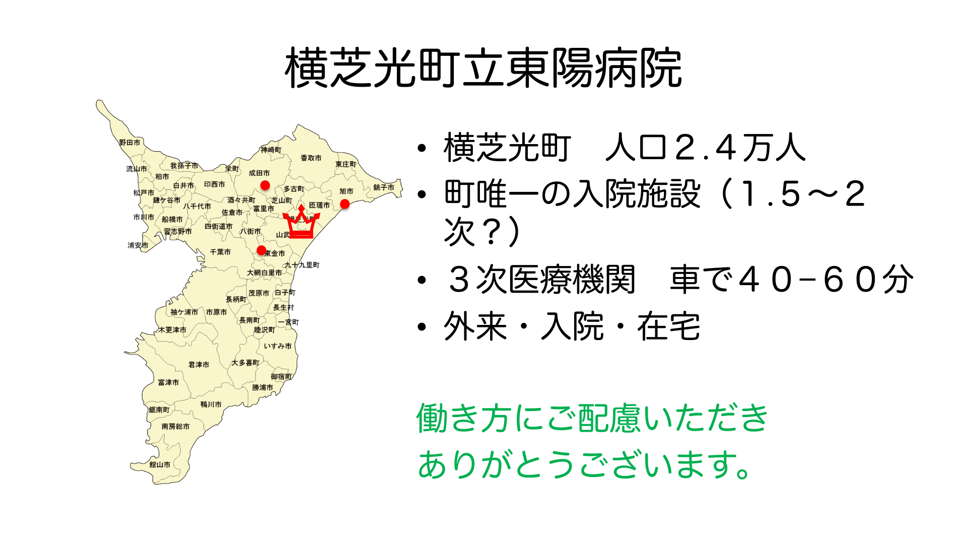 #2. 横芝光町立東陽病院 • 横芝光町 人口2.4万人 • 町唯一の入院施設(1.5∼2 次?) • 3次医療機関 車で40−60分 • 外来・入院・在宅 働き方にご配慮いただき ありがとうございます。