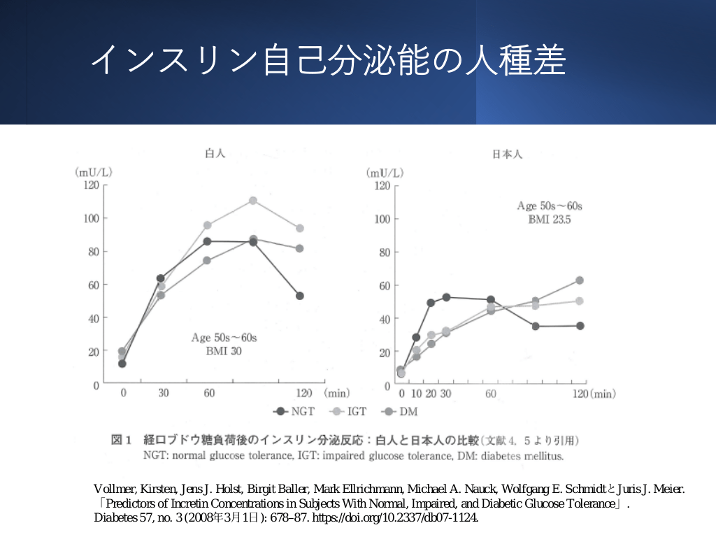 インスリン自己分泌能の人種差 Vollmer, Kirsten, Jens J. Holst, Birgit Baller, Mark Ellrichmann, Michael A. Nauck, Wolfgang E. SchmidtとJuris J. Meier. 「Predictors of Incretin Concentrations in Subjects With Normal, Impaired, and Diabetic Glucose Tolerance」. Diabetes 57, no. 3 (2008年3月1日): 678–87. https://doi.org/10.2337/db07-1124.