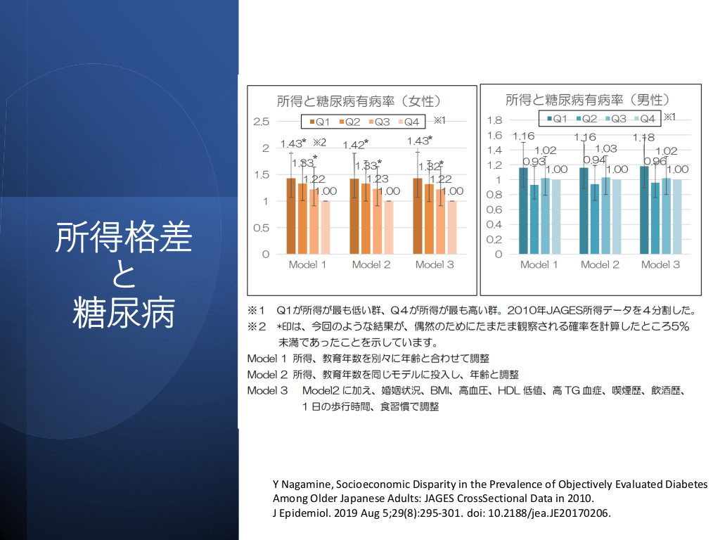 所得格差 と 糖尿病 Y Nagamine, Socioeconomic Disparity in the Prevalence of Objectively Evaluated Diabetes Among Older Japanese Adults: JAGES CrossSectional Data in 2010. J Epidemiol. 2019 Aug 5;29(8):295-301. doi: 10.2188/jea.JE20170206.