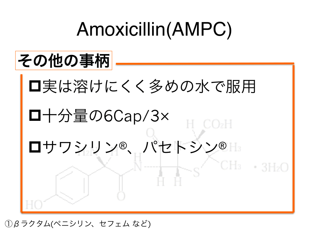 #13. Amoxicillin(AMPC) その他の事柄 p実は溶けにくく多めの水で服用 p十分量の6Cap/3× pサワシリン 、パセトシン ®︎ ®︎ ①βラクタム(ペニシリン、セフェム など)