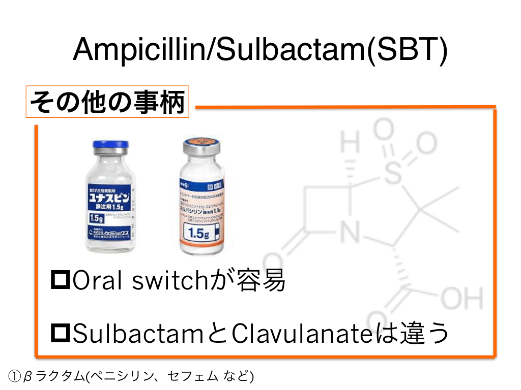 #16. Ampicillin/Sulbactam(SBT) その他の事柄 pOral switchが容易 pSulbactamとClavulanateは違う ①βラクタム(ペニシリン、セフェム など)
