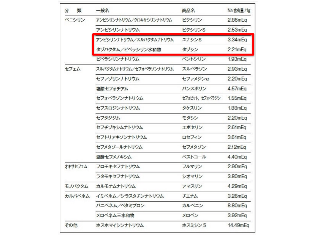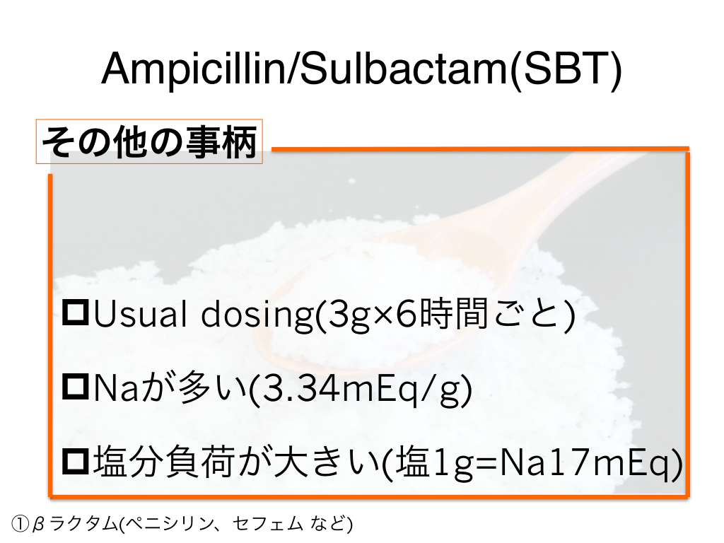 #17. Ampicillin/Sulbactam(SBT) その他の事柄 pUsual dosing(3g×6時間ごと) pNaが多い(3.34mEq/g) p塩分負荷が大きい(塩1g=Na17mEq) ①βラクタム(ペニシリン、セフェム など)