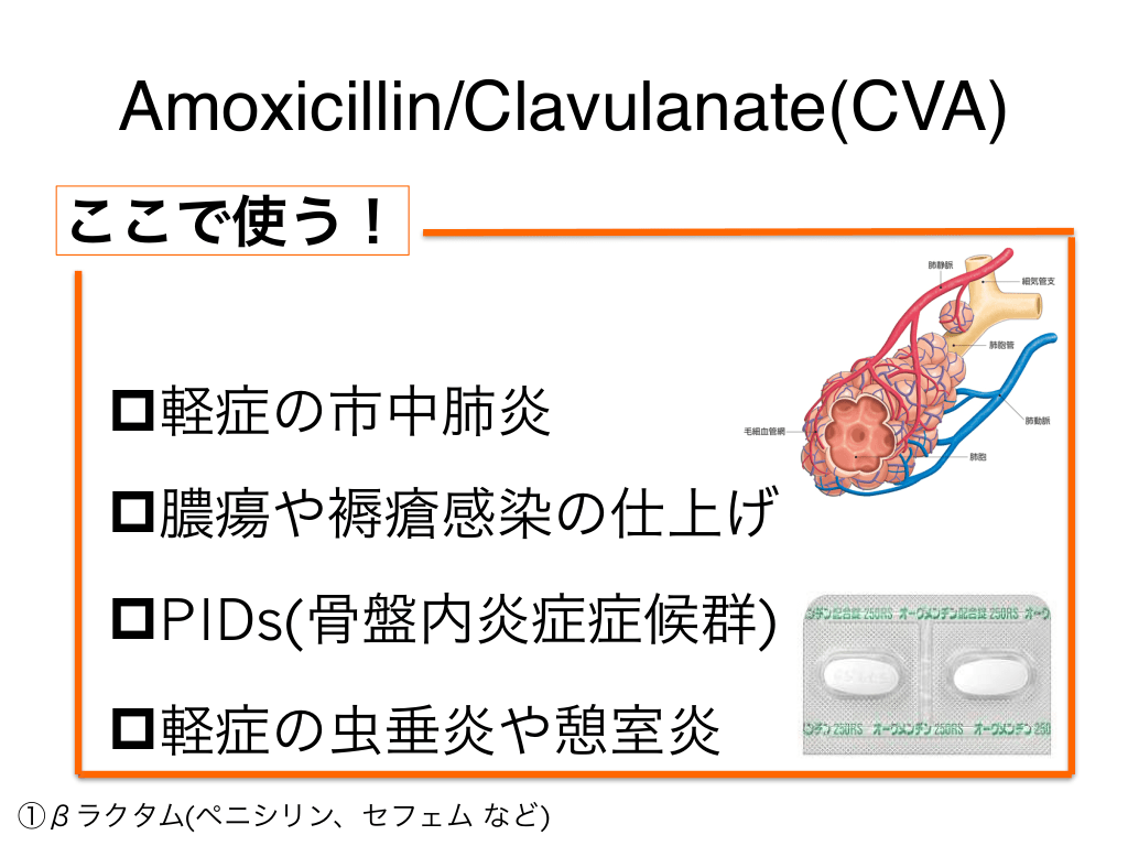 #19. Amoxicillin/Clavulanate(CVA) ここで使う! p軽症の市中肺炎 p膿瘍や褥瘡感染の仕上げ pPIDs(骨盤内炎症症候群) p軽症の虫垂炎や憩室炎 ①βラクタム(ペニシリン、セフェム など)