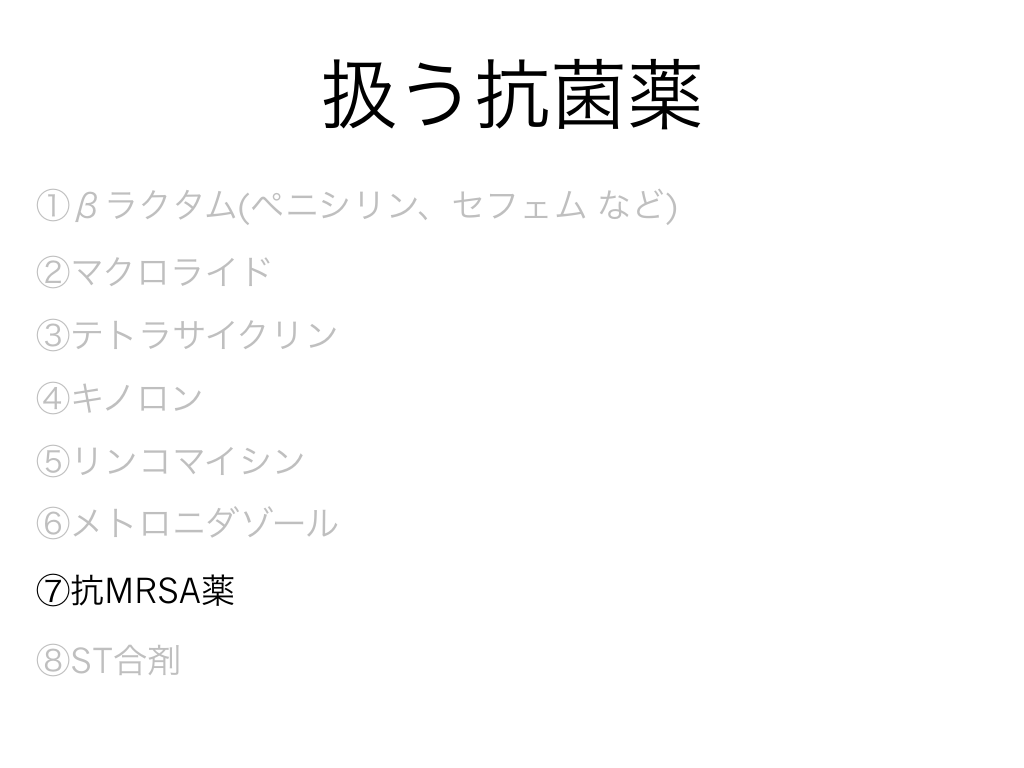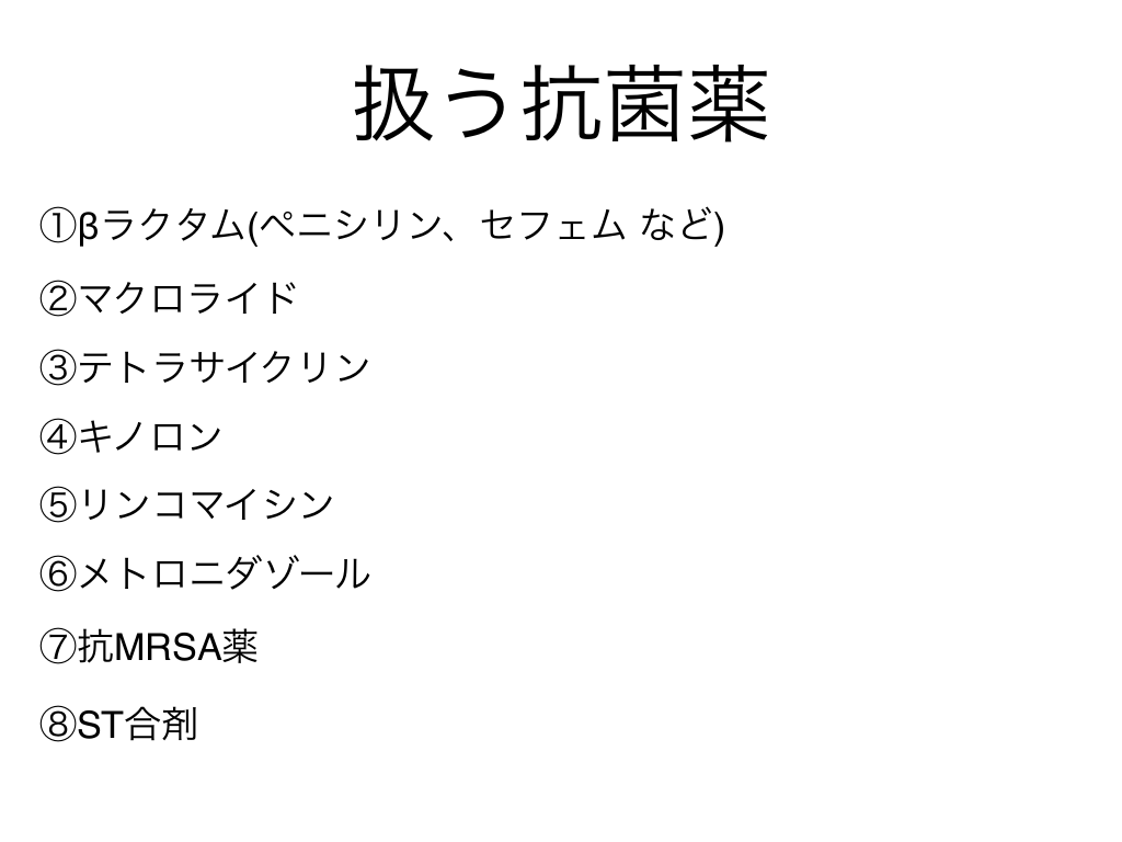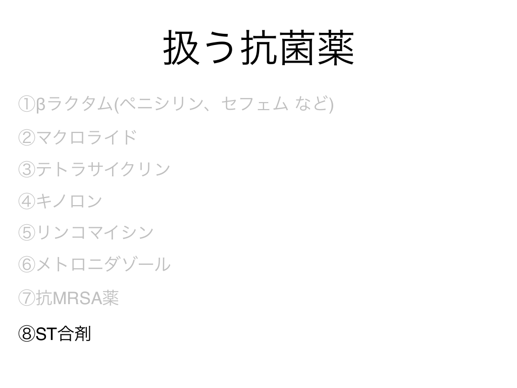 #2. 扱う抗菌薬 ①βラクタム(ペニシリン、セフェム など) ②マクロライド ③テトラサイクリン ④キノロン ⑤リンコマイシン ⑥メトロニダゾール ⑦抗MRSA薬 ⑧ST合剤