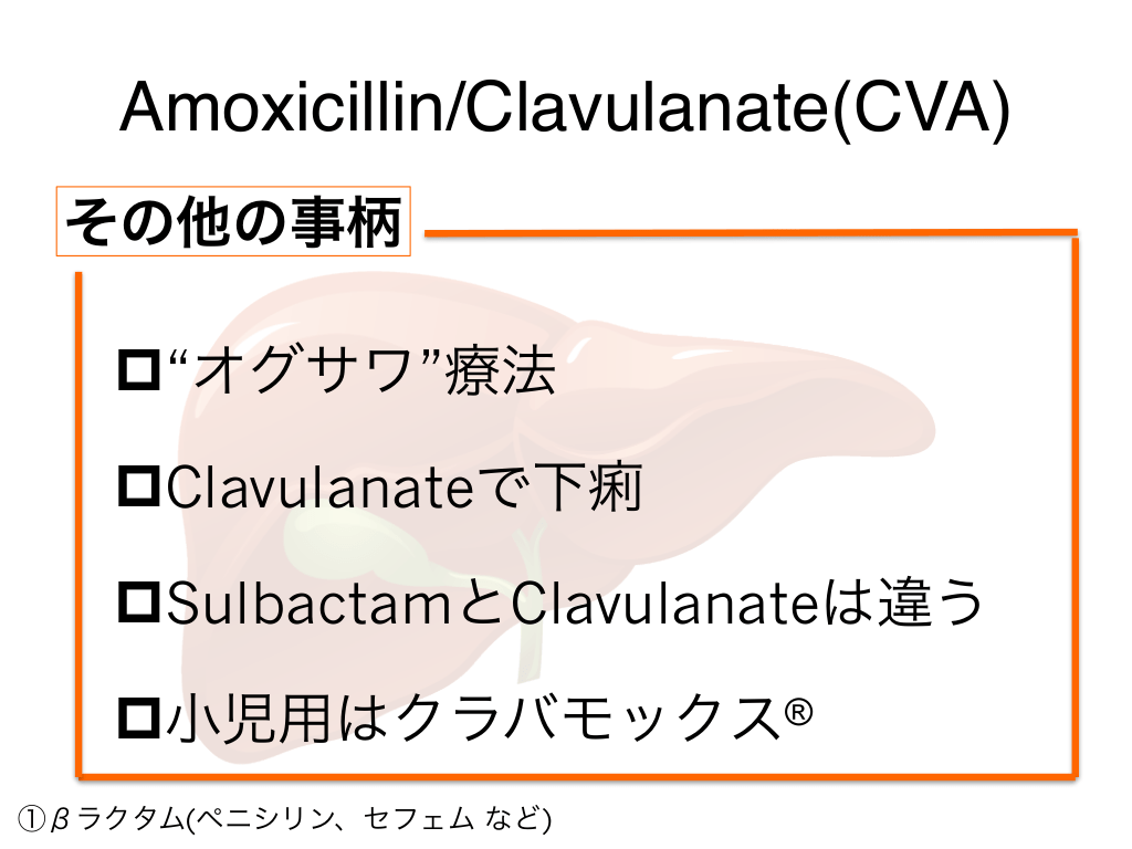 #20. Amoxicillin/Clavulanate(CVA) その他の事柄 p“オグサワ”療法 pClavulanateで下痢 pSulbactamとClavulanateは違う p小児用はクラバモックス ®︎ ①βラクタム(ペニシリン、セフェム など)