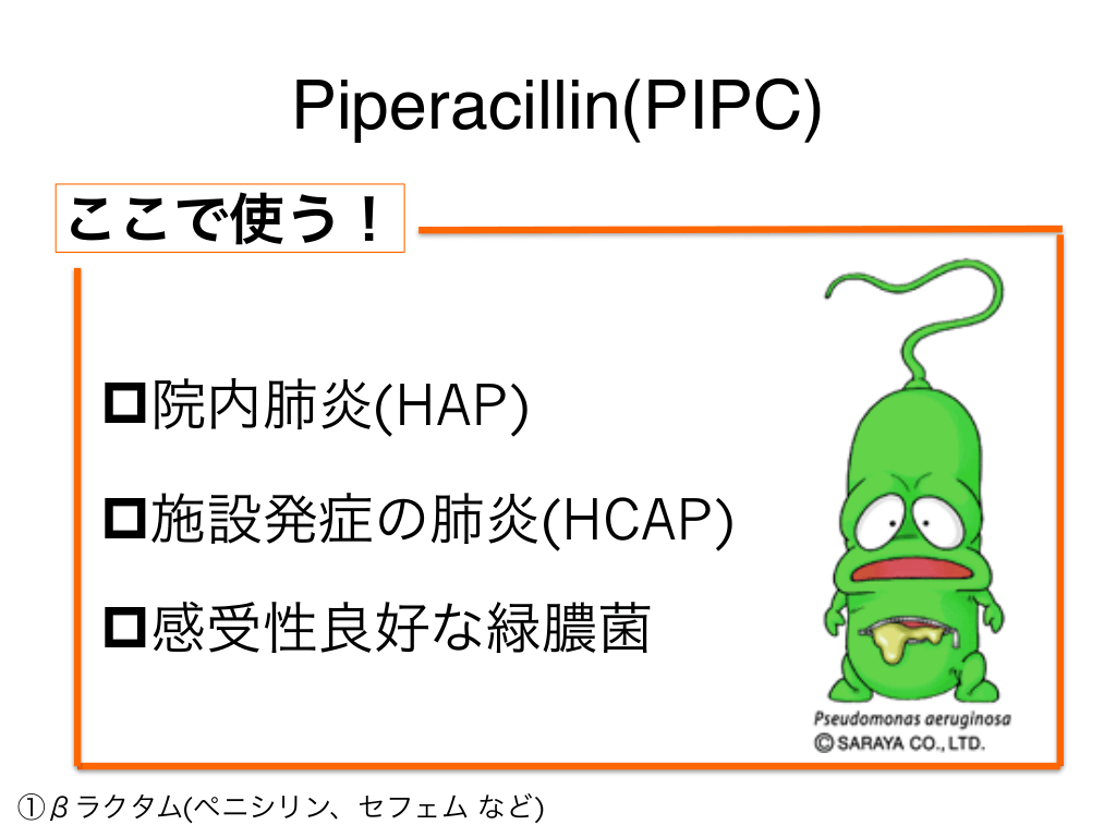#22. Piperacillin(PIPC) ここで使う! p院内肺炎(HAP) p施設発症の肺炎(HCAP) p感受性良好な緑膿菌 ①βラクタム(ペニシリン、セフェム など)
