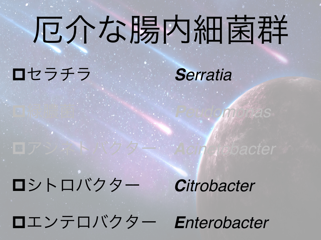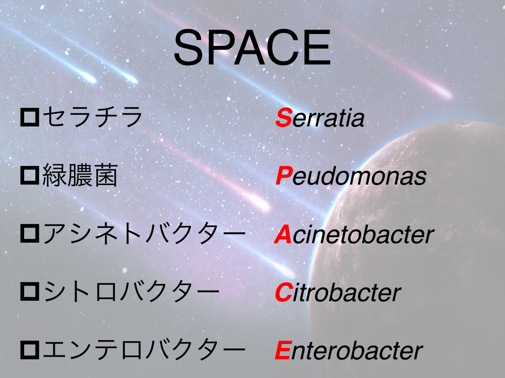 #24. SPACE pセラチラ Serratia p緑膿菌 Peudomonas pアシネトバクター Acinetobacter pシトロバクター Citrobacter pエンテロバクター Enterobacter